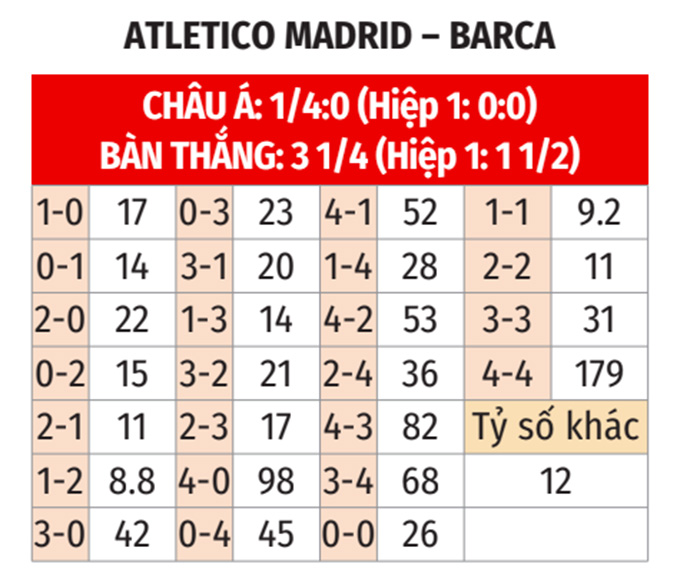 - Lẻ bàn thắng: 6/9 trận đối đầu gần nhất, 7/9 trận gần đây của Atletico Madrid và 7/10 trận vừa qua của Barca đều có tổng bàn thắng là lẻ. Hơn nữa, 6/7 trận sân nhà gần đây của Atletico Madrid cũng có tổng bàn thắng không chia hết cho 2.
