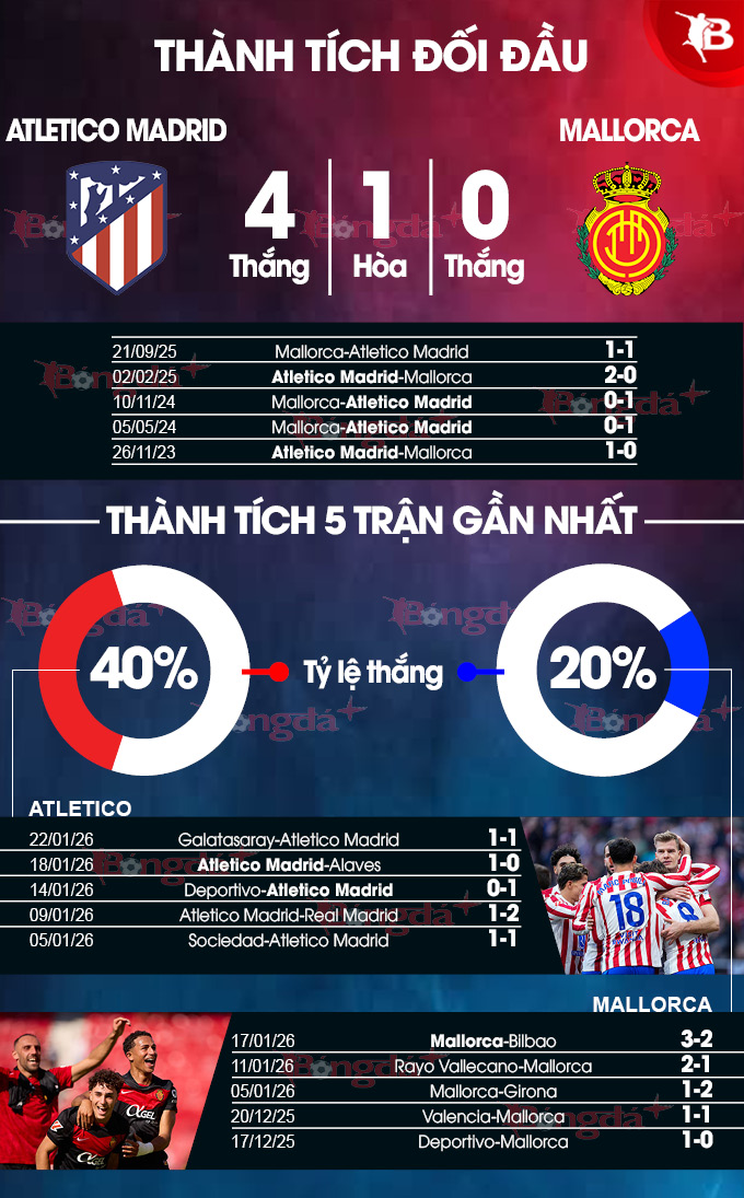Atletico Madrid đã thắng Mallorca trong cả 3 trận sân nhà gần nhất ở mọi đấu trường.