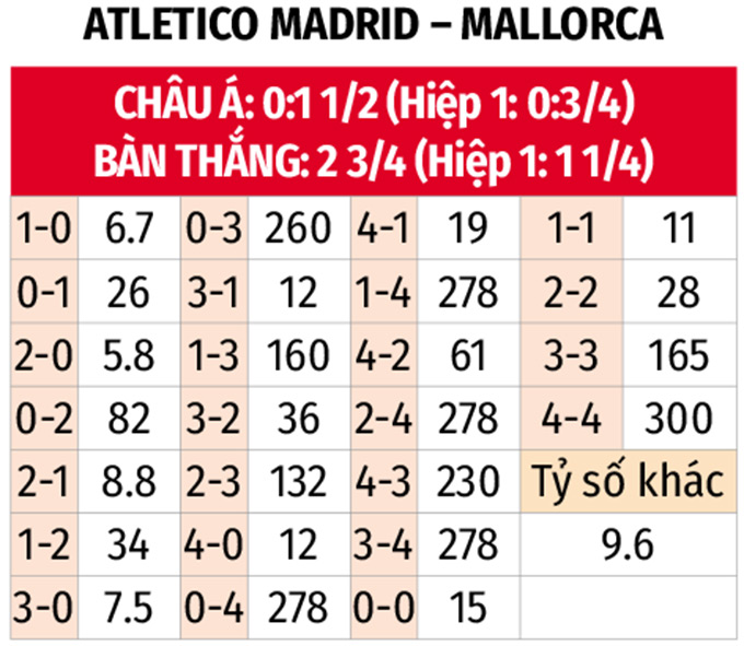 - Tối đa 1 bàn hiệp 1: 3/4 trận sân khách gần đây của Mallorca cùng 4/5 trận vừa qua của Atletico Madrid đều có nhiều nhất 1 bàn trong hiệp đầu. 5 trận đối đầu gần nhất chỉ xuất hiện 2 bàn thắng trước giờ nghỉ.