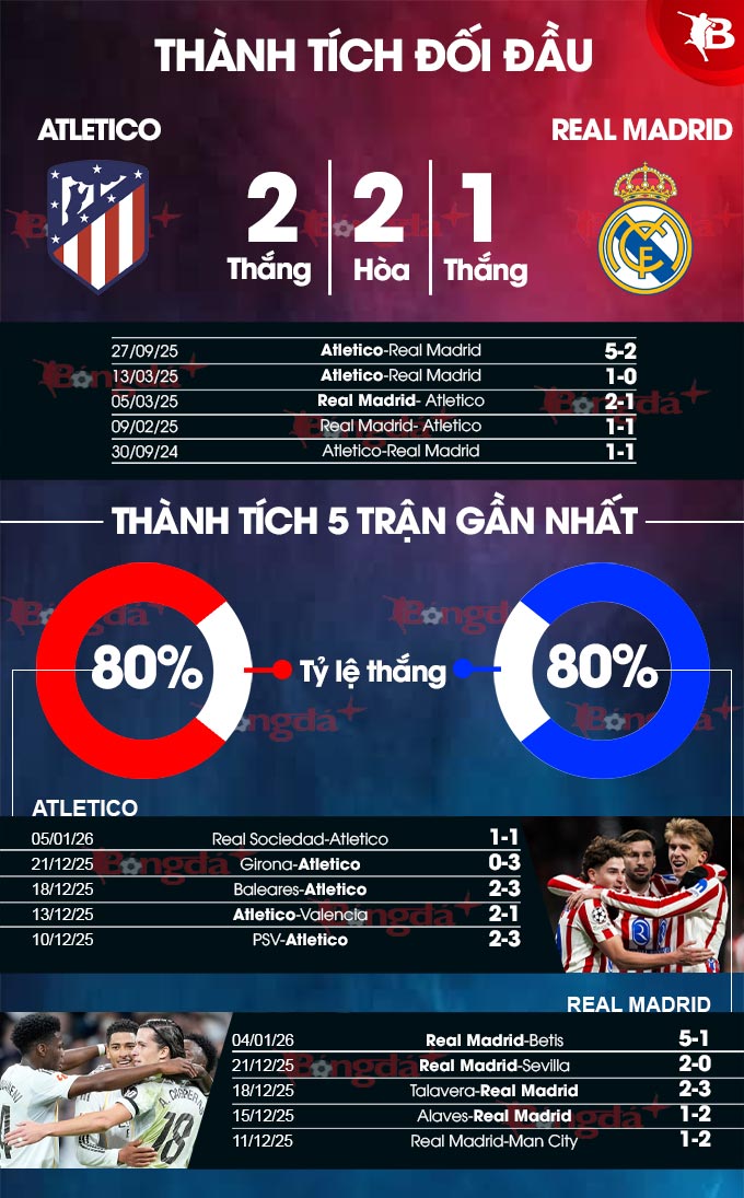 Thách thức lớn dành cho Atletico Madrid đêm nay là Real Madrid, đội đang có dấu hiệu khởi sắc với chuỗi 4 chiến thắng liên tiếp, bao gồm cả chiến thắng thuyết phục 5-1 trên sân nhà trước Real Betis hôm Chủ nhật, bất chấp việc thiếu vắng Kylian Mbappe do chấn thương. Áp lực dành cho HLV Xabi Alonso đã giảm bớt phần nào và ông có thể củng cố hơn nữa vị trí của mình trên băng ghế huấn luyện, khi biết rằng hai chiến thắng sẽ mang về danh hiệu đầu tiên kể từ khi tiếp quản vị trí từ Carlo Ancelotti vào cuối mùa giải trước.