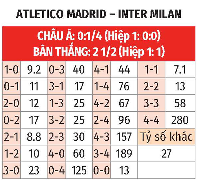 Phong độ của Atletico vs Inter không có sự chênh lệch. Atletico có lợi thế sân nhà còn Inter đang có vấn đề khi gặp các CLB lớn ở mùa giải này. Có khả năng, đội bóng của HLV Chivu sẽ trắng tay trên đất Tây Ban Nha.