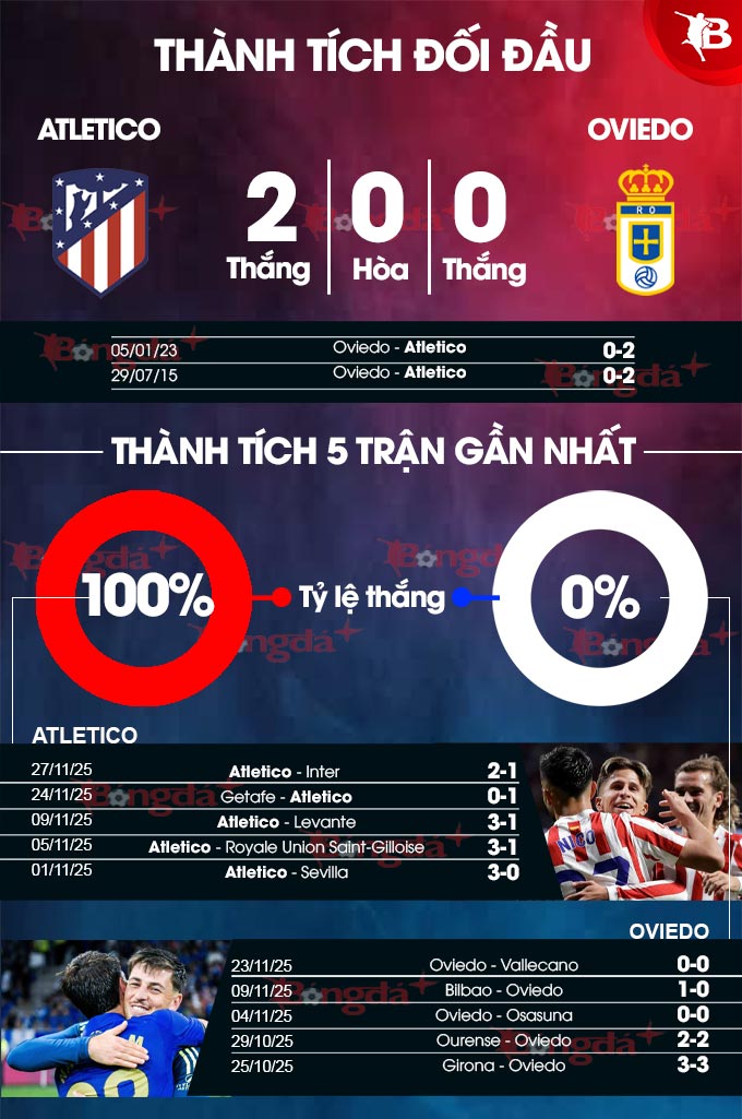 Phong độ của Atletico vs Oviedo đang rất chênh lệch. Cụ thể, trong khi Atletico toàn thắng 5 trận gần nhất thì Oviedo không thắng 5 trận mới đây. Trên sân nhà, Atletico cũng có thành tích tương tự. Theo chiều ngược lại, tân binh Oviedo chỉ thắng 1 trong 5 trận sân khách vừa qua.