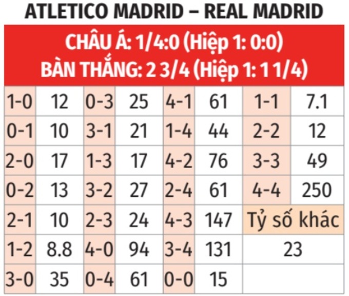 - Nhiều bàn thắng cả trận: 6/8 trận sân nhà gần đây của Atletico ở La Liga đều kết thúc với tối thiểu 3 bàn thắng. 8/10 trận đấu vừa qua của Real Madrid trên mọi đấu trường xảy ra tình trạng tương tự.