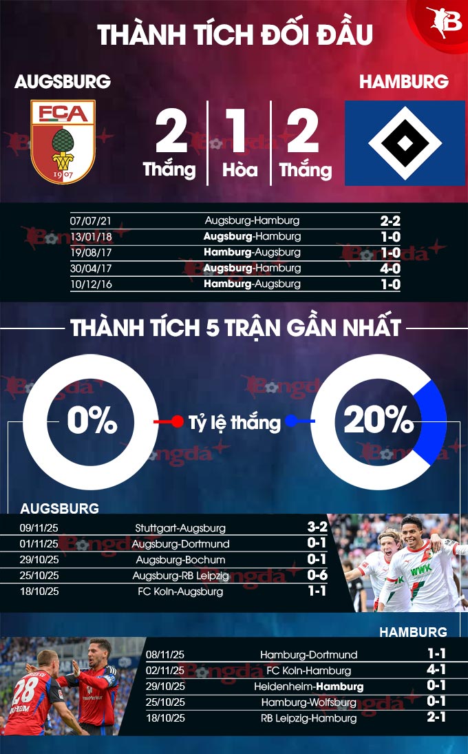 - Ít bàn thắng: Augsburg mới ghi 9 bàn từ đầu mùa chỉ nhiều hơn đội bét bảng Heidenheim (8 bàn). Với Hamburg, các chân sút đội bóng này cũng chỉ ghi vỏn vẹn 2 bàn sau 5 trận sân khách, thấp nhất giải. 3/5 trận đối đầu gần nhất khép lại với tối đa 1 bàn thắng.