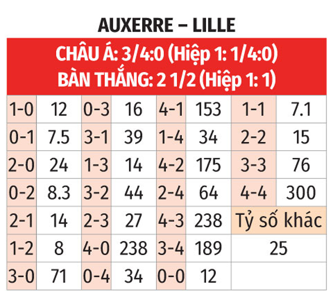 - Tối thiểu 1 bàn hiệp 1: 4/5 trận đấu vừa qua giữa Auxerre vs Lille có tối thiểu 1 bàn hiệp 1. Chưa hết, 3/5 trận vừa qua của Auxerre và 4/6 trận vưa qua của Lille xảy ra tình trạng tương tự.