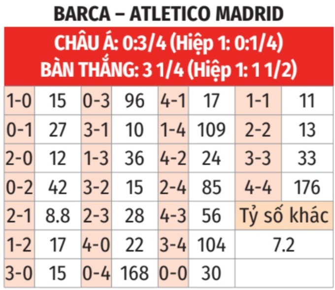 - Lẻ bàn thắng: 5/6 trận đấu gần đây của Barca kết thúc lẻ bàn thắng. Tình trạng tương tự xảy ra ở 3/4 trận sân khách vừa qua của Atletico.