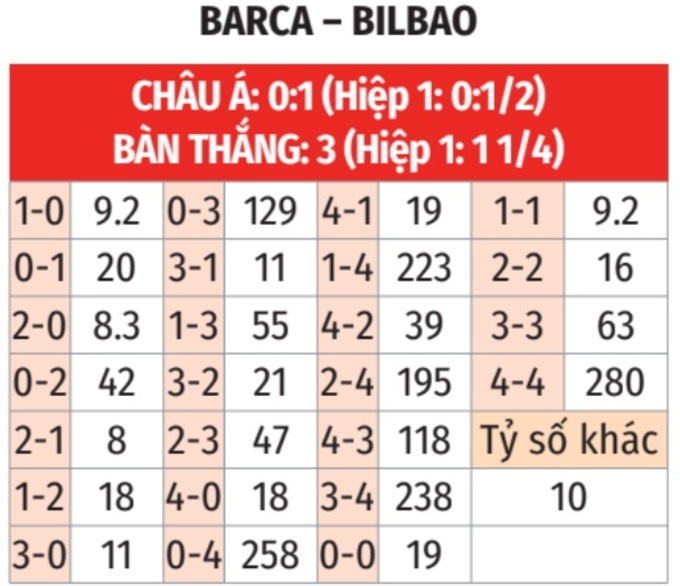 - Tối đa 2 bàn cả trận: Cả 4 trận đấu gần đây của Barca đều kết thúc với không quá 2 bàn thắng. Tình trạng tương tự xảy ra ở 7/9 trận vừa qua của Bilbao.