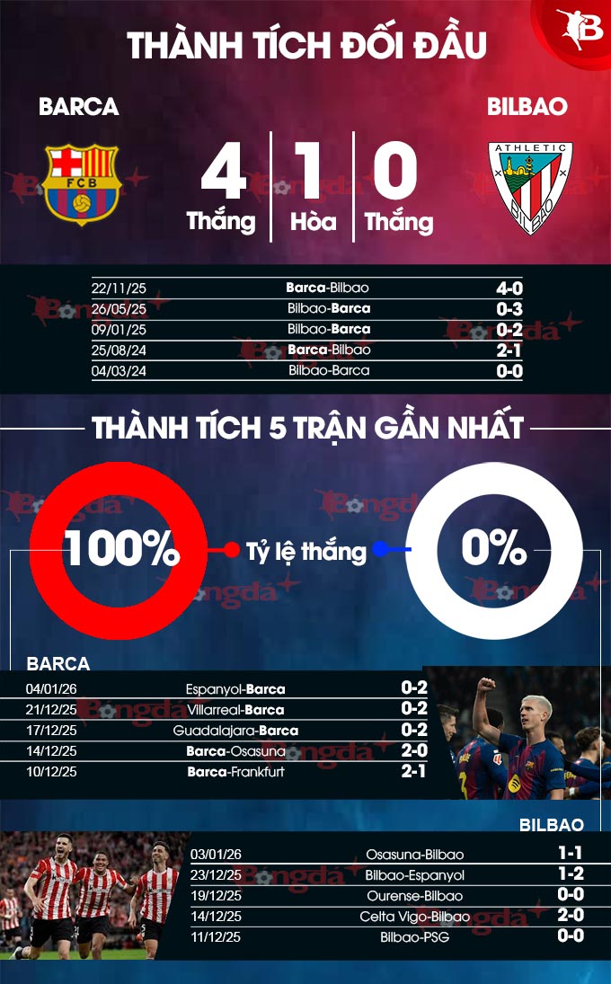 Đã vậy, Bilbao còn thường xuyên bị Barca át vía trong quá khứ. Thống kê chỉ ra rằng, đội bóng xứ Catalunya bất bại trong 17 lần đụng độ với đội bóng xứ Basque tại các giải chính thức gần đây. Cụ thể, Barca bị cầm hòa 5 trận, còn lại giành đến 12 chiến thắng. Trong đó, ở lần chạm trán mới đây nhất tại La Liga, thầy trò HLV Hansi Flick nghiền nát Bilbao 4 bàn không gỡ.