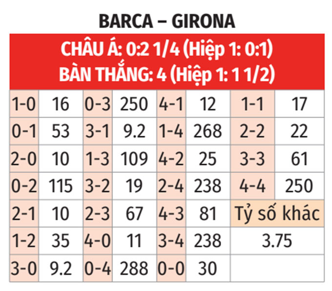 - Lưới rung cuối trận: 3/4 trận gần nhất giữa Barca và Girona có bàn thắng được ghi trong 10 phút cuối. 3/4 trận vừa qua của Barca bảng tỷ số còn cập nhật từ phút 88 trở đi.
