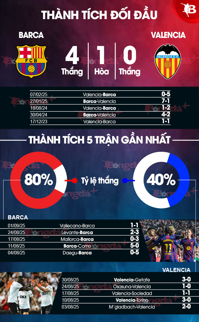- Lẻ bàn thắng: 5/8 lần chạm trán giữa 2 đội gần đây kết thúc lẻ bàn thắng. Tình trạng tương tự xảy ra ở 4/5 trận gần đây của Barca và 6/8 trận mới nhất của Valencia ở La Liga.