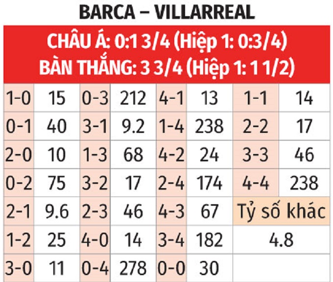- Nhiều góc hiệp 1: Những trận đối đầu giữa hai đội gần đây thường có xu hướng bùng nổ góc sớm, khi 4/5 trận gần nhất đều kết thúc với tối thiểu 5 tình huống đá phạt góc trong 45 phút đầu tiên, trong đó trận lượt đi có 7 góc. Kịch bản nhiều góc hiệp 1 khả năng sẽ tiếp tục diễn ra, khi 3/4 trận gần đây của Barca cùng 3/5 trận vừa qua của Villarreal cũng xuất hiện ít nhất 5 góc trước giờ nghỉ.