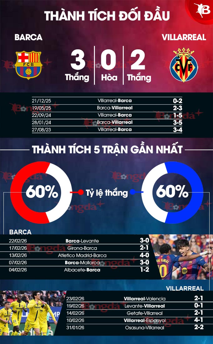 Lịch sử cho thấy Barca đã áp đảo hoàn toàn ở các cuộc gặp gần đây, thắng 13 trong 18 lần đối đầu gần nhất. Tuy nhiên, Villarreal đã giành chiến thắng kịch tính 3-2 trên sân của Barca ở lượt về mùa giải trước, nhưng đó là thời điểm mà chức vô địch đã an bài. Trong bối cảnh hiện nay, Barca chắc chắn sẽ không muốn sảy chân, bởi điều đó gần như sẽ khiến họ không thể giữ được ngôi đầu.