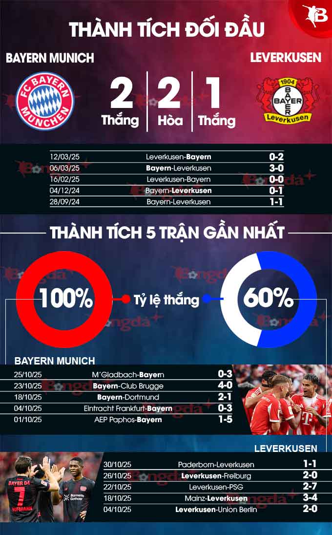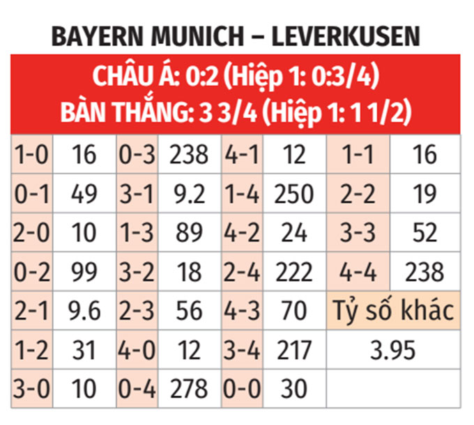 - Tối đa 3 bàn: 6/8 trận gần đây của Leverkusen có tối đa 3 bàn. Cả 6 trận gần nhất giữa đội bóng này và Bayern số lần lưới rung cũng không lên được đến 4.