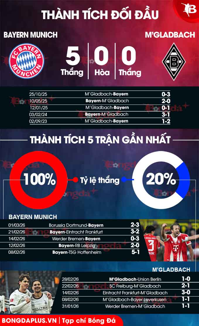 - Lưới rung cuối trận: 3 trận gần đây của M'Gladbach đều có bàn thắng được ghi trong 15 phút cuối. 6/7 trận gần nhất giữa đội bóng này và Bayern bảng tỷ số vẫn cập nhật sau phút 80.