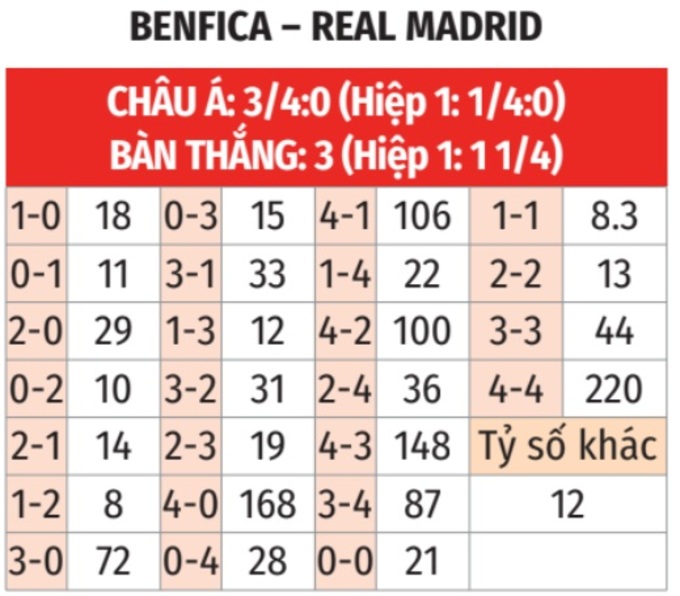 - Nhiều góc hiệp 1: 5/6 trận gần đây của Benfica đều có từ 5 quả phạt góc trở lên trong hiệp 1. Tình trạng tương tự xảy ra ở 8/10 trận mới nhất của Real Madrid.