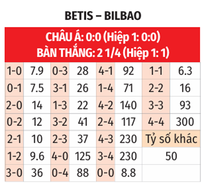 - Chẵn bàn thắng: 4/5 trận đối đầu vừa qua giữa Betis vs Bilbao có tổng bàn thắng chia hết cho 2. Ngoài ra, 5/9 trận vừa qua của Betis và 10 trận mới đây của Bilbao đều chứng kiến điều tương tự.