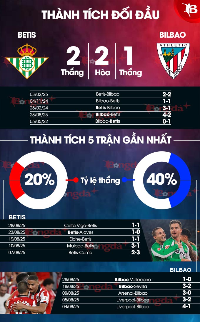 Chưa hết, Bilbao cũng chơi không quá hay trên sân khách khi không thắng 5/7 trận gần nhất. Tuy nhiên, Bilbao chưa bao giờ "vui" khi hành quân tới sân của Betis khi hòa 4, thắng 2 ở 6 trận vừa qua. Có khả năng, trận đấu tới sẽ kết thúc với kết quả hòa.