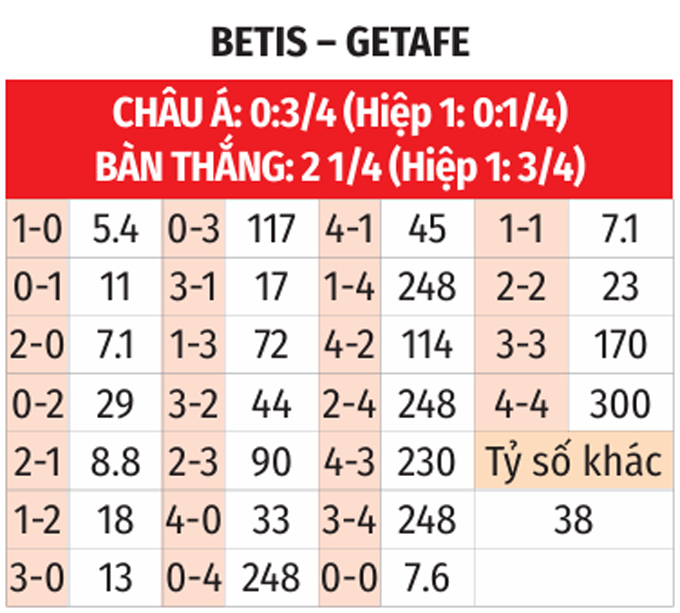 - Lẻ bàn thắng: 6/10 trận đối đầu trước đó giữa Betis vs Getafe có tổng bàn thắng không chia hết cho 2. Ngoài ra, 8/10 trận vừa xong của Getafe chứng kiến điều tương tự.