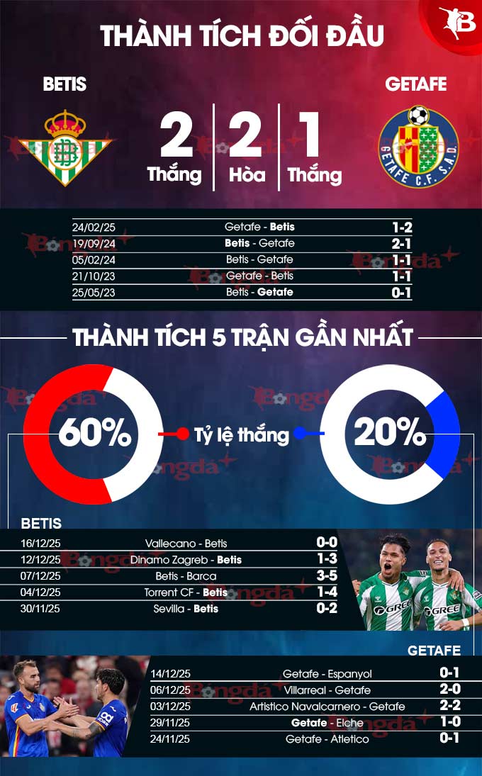 Chưa hết, Betis lấn lướt Getafe ở 10 trận gặp nhau vừa qua khi thắng 5, hòa 3 và thua 2. Ngoài ra, trong 6 lần gần nhất hành quân tới sân của Betis, Getafe chỉ thắng có 1. Còn lại, họ thua 3 và hòa 2.