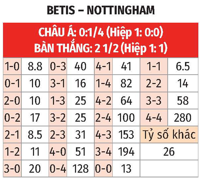 - Lẻ bàn thắng: 2/3 trận gần nhất trên sân nhà của Betis có tổng bàn thắng không chia hết cho 2. Ngoài ra, 3/4 trận vừa qua Nottingham đều chứng kiến điều tương tự.