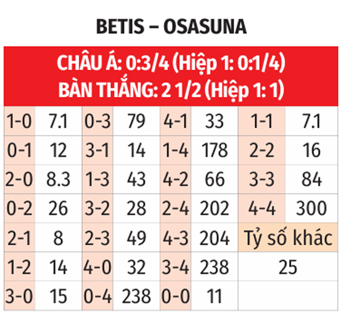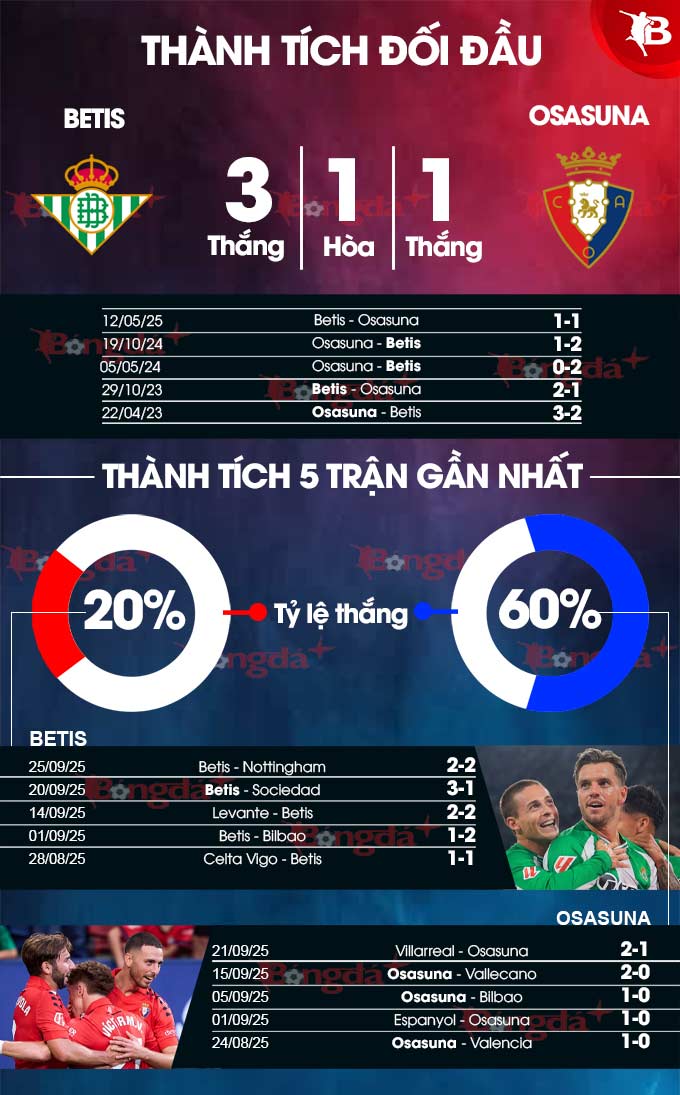 Tuy nhiên, Betis có lợi thế sân nhà và thắng 2/4 trận vừa đây. Chưa hết, Betis có thành tích đối đầu trực tiếp tốt hơn Osasuna. Họ cũng không thua Osasuna ở 9 trận gần nhất tiếp đối thủ này trên sân nhà. Do đó, Betis có khả năng sẽ có 3 điểm ở trận này.