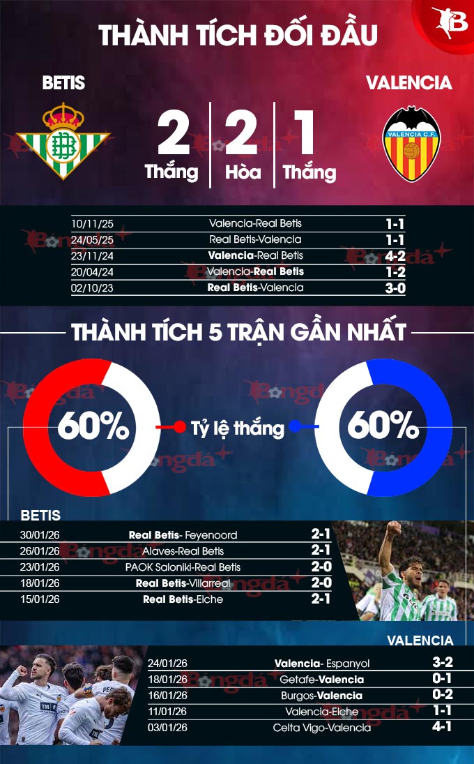 - Trên 2 bàn: 6/8 trận Betis tiếp đón Valencia gần đây ở La Liga đều có trên 2 bàn. 4/5 trận sân nhà gần nhất của Betis số lần lưới rung cũng đều chạm ngưỡng 3.