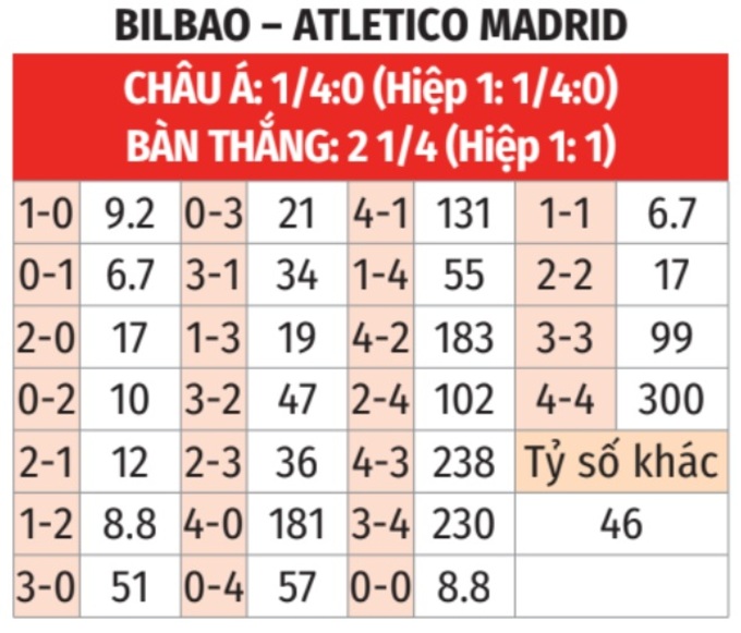 - Tối thiểu 2 bàn hiệp 1: 3/4 trận gần đây của Bilbao tại các giải chính thức đều xuất hiện từ 2 bàn thắng trở lên trong hiệp 1. Tình trạng tương tự xảy ra ở 3/4 trận vừa qua của Atletico ở La Liga.