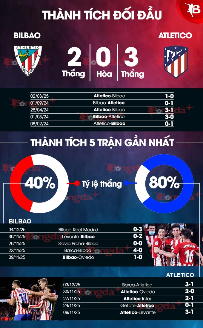 Chưa kể, Atletico còn có sự ủng hộ của quá khứ. Theo thống kê, đội bóng của ông Diego Simeone toàn thắng trong 3 lần đụng độ Bilbao gần đây trong khuôn khổ La Liga. Trong đó ở lần gặp mới đây nhất ở lượt về mùa trước, họ đánh bại đội bóng xứ Basque nhờ pha ghi bàn duy nhất của tiền đạo Julian Alvarez ở hiệp 2.