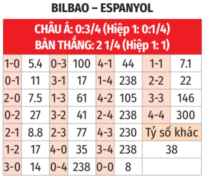 - Tối đa 2 bàn cả trận: 8/10 trận đấu gần đây của Bilbao đều kết thúc với tối đa 2 bàn thắng. Tình trạng tương tự xảy ra ở 5/6 trận vừa qua của Espanyol.
