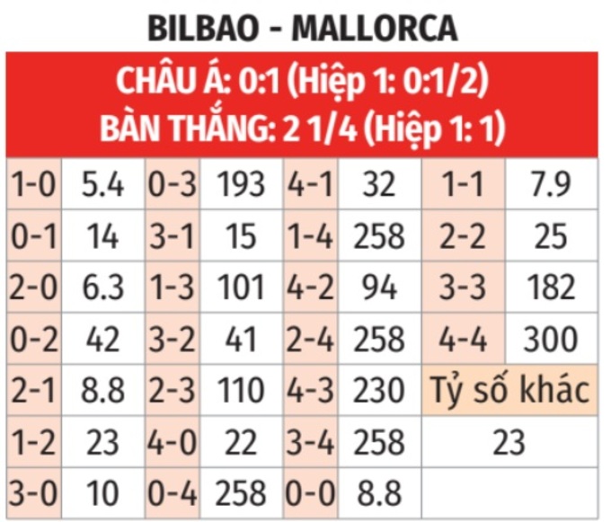 - Nhiều góc hiệp 1: 8/10 trận đấu gần đây của Bilbao đều xuất hiện từ 5 quả phạt góc trở lên trong hiệp 1. Tình trạng tương tự xảy ra ở 4/5 trận vừa qua của Mallorca.
