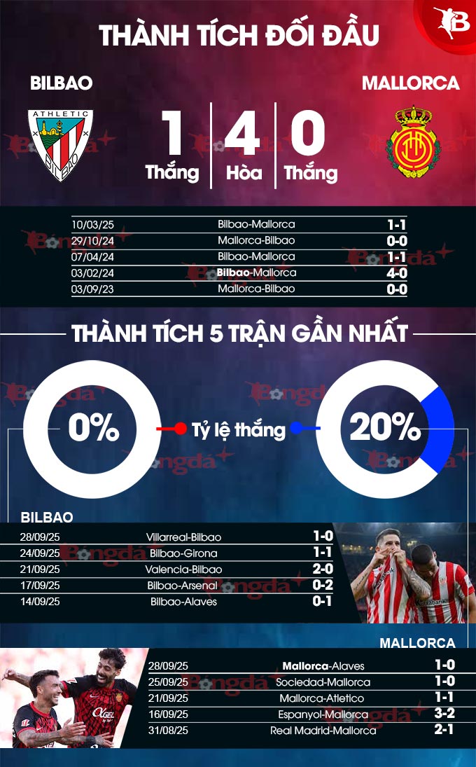 So với Bilbao, Mallorca còn bết bát hơn. Họ mới thắng duy nhất 1 trận ở La Liga mùa này và hiện đang đứng áp chót bảng xếp hạng. Đặc biệt, Mallorca rất yếu bóng vía trên sân khách. Bằng chứng là trong 7 chuyến hành quân ở La Liga gần đây, Mallorca không biết mùi chiến thắng. Cụ thể, họ thua 6 và chỉ giành được 1 kết quả hòa.