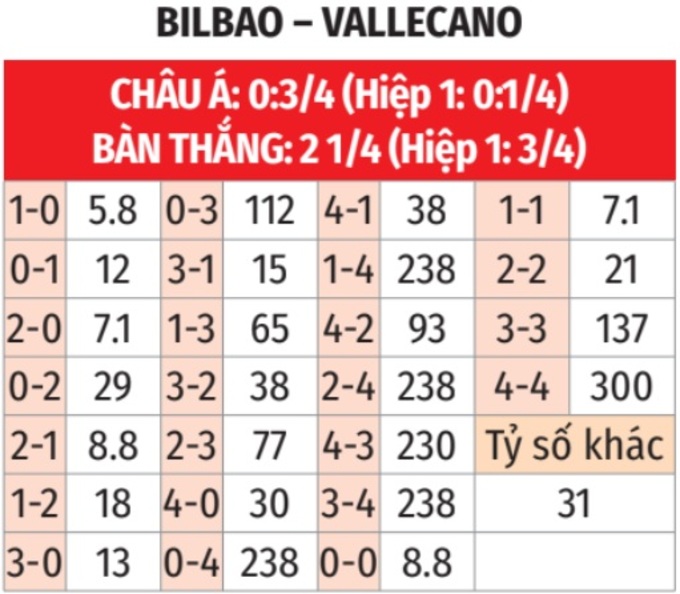 Thế nên, tuy có nhiều lợi thế và được đánh giá cao hơn, nhưng Bilbao sẽ không dễ dàng khuất phục Vallecano. Giỏi lắm, đội chủ nhà chỉ có thể đánh bại đoàn quân của ông Inigo Perez với cách biệt 1 bàn.