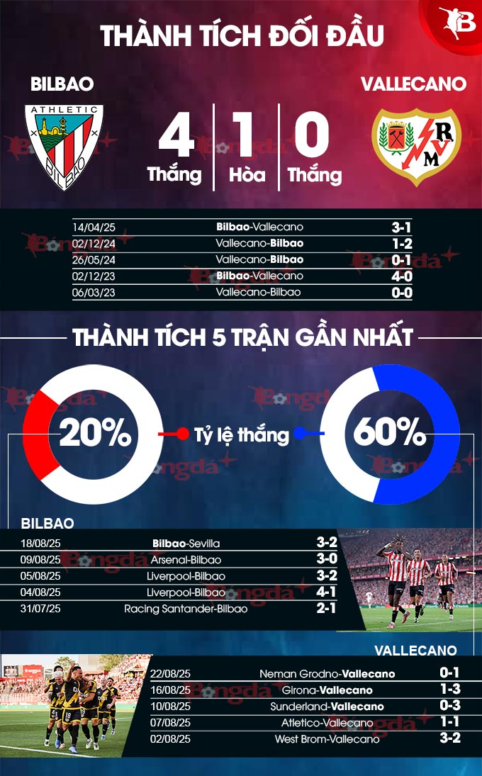 Quá khứ cũng ủng hộ Bilbao. Những con số không hề biết nói dối, khi đội bóng xứ Basque áp đảo Vallecano trong 7 lần chạm trán gần đây với thành tích hòa 1 và thắng 6 trận. Gần đây nhất là ở lượt về La Liga mùa trước, Bilbao đánh bại Vallecano với tỉ số 3-1. Nhưng nói vậy không có nghĩa là Bilbao sẽ dễ dàng nghiền nát Vallecano ở trận đấu tại vòng 2 La Liga.