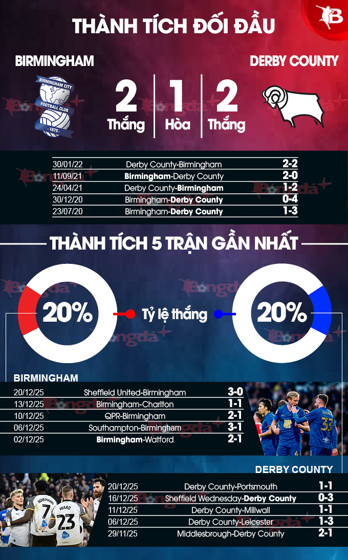 - Chẵn bàn thắng: 6/8 cuộc chạm trán gần nhất, 9/11 cuộc đối đầu gần đây tại Birmingham và 3/4 trận vừa qua của Derby County đều khép lại với tổng bàn thắng là chẵn. Trận này khó có ngoại lệ.