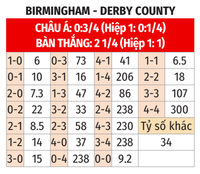 - Derby County thắng theo châu Á: Derby County thắng 6/9 cuộc đối đầu gần nhất, thắng 5/8 chuyến làm khách gần đây tại Birmingham và thắng 9/11 chuyến làm khách vừa qua. Còn Birmingham thua cả 4 trận vừa qua. Do đó, có thể tin vào Derby County ở trận này.