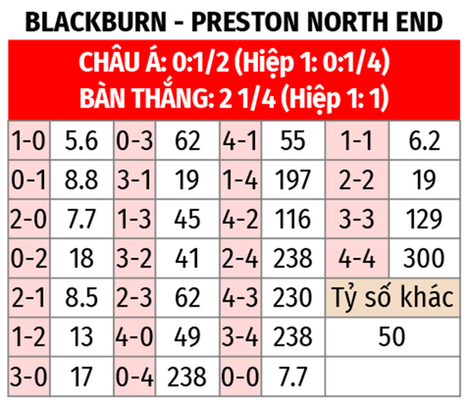 • Preston thắng châu Á hiệp 1: Đội khách đang sở hữu thành tích thắng châu Á 3 trận liên tiếp gần đây trong 45 phút đầu tiên. Với Blackburn, đội chủ nhà thua châu Á hiệp 1 ở 4/5 trận gần nhất tại tổ ấm Edwood Park.