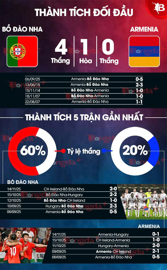 - Bồ Đào Nha giữ sạch lưới nhà: Bồ Đào Nha giữ sạch lưới nhà ở 3/4 cuộc đối đầu gần nhất với Armenia, ở cả 3 lần đón tiếp Armenia tại quê nhà. Không những thế, Armenia còn không có khả năng ghi được bàn thắng nào ở 4/5 trận gần đây, ở cả 2 chuyến làm khách vừa qua tại vòng loại World Cup 2026 khu vực châu Âu.