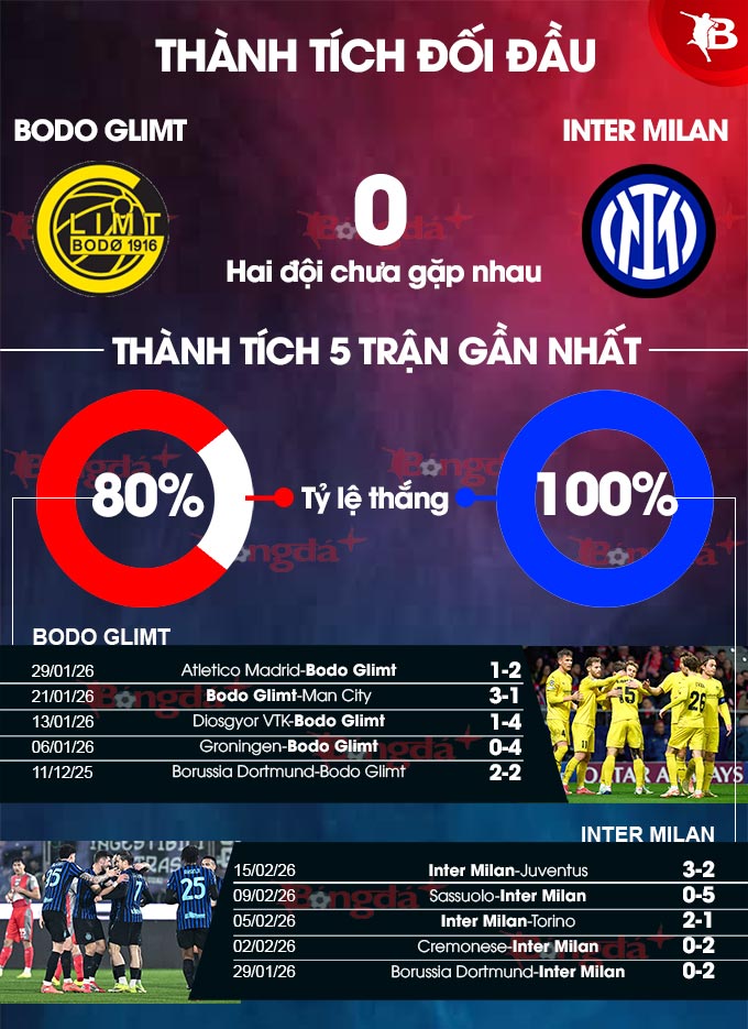 - Lưới rung cuối trận: 5/8 trận gần đây của Bodo Glimt có bàn thắng được ghi trong 15 phút cuối. 5/7 trận vừa qua của Inter Milan bảng tỷ số vẫn cập nhật sau phút 84.