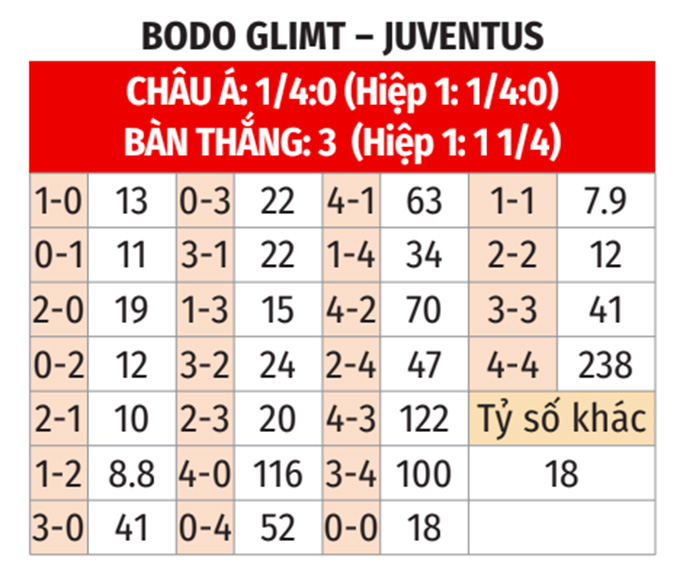 - Juventus không thắng theo châu Á: Juventus thua 4, hòa 1, thắng 1 ở 6 trận gần nhất. Họ cũng thua 3, hòa 1, thắng 1 ở 5 chuyến xa nhà gần đây. Trong khi đó, Bodo Glimt thắng 5/7 trận sân nhà vừa qua theo châu Á. Vì thế, nhiều khả năng Juve không thắng theo châu Á ở chuyến làm khách trên đất Na Uy lần này.