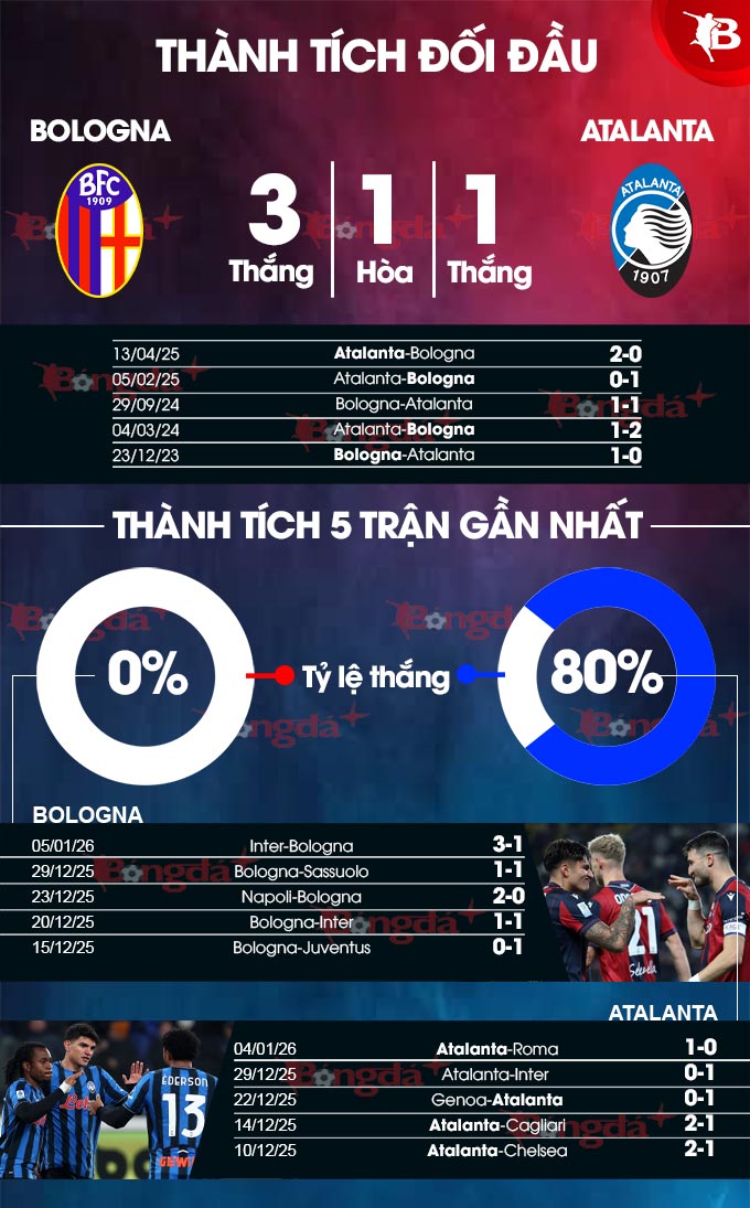 Alex Lawes (Chuyên gia của The Stats Zone): “Bologna áp đảo ở 6 cuộc đối đầu gần nhất với Atalanta khi thắng 4, hòa 1 và chỉ thua 1. Đây là lợi thế rất lớn để họ giành chiến thắng ở trận này”.
