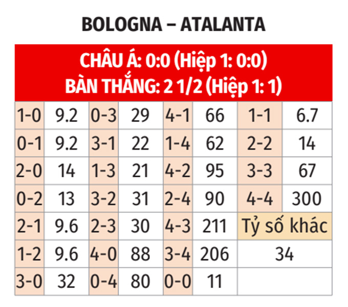 - Bologna thắng theo châu Á: Bologna thắng 5/6 cuộc đối đầu gần nhất, thắng cả 2 lần gần nhất đón tiếp Atalanta. Còn Atalanta thua 6/9 trận gần đây tại Serie A. Vì thế, giới mộ điệu có thể tin vào Bologna ở trận này.