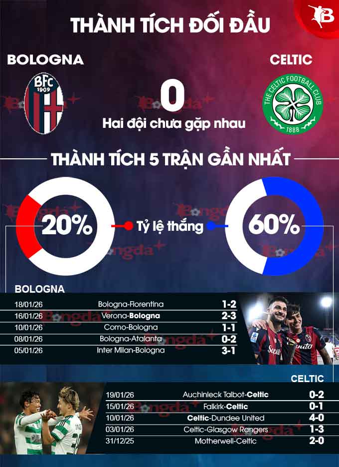 Ở chiều ngược lại, Celtic đang gây ấn tượng với chuỗi 3 trận toàn thắng liên tiếp. Khi lần lượt so T cùng Dundee United, Falkirk và mới nhất là Auchinleck Talbot, họ ghi tổng cộng tới 7 bàn mà không một lần để thủng lưới. Nếu nhìn rộng hơn thì đại diện Scotland đã đánh bại 5 đối thủ trong 7 trận đấu vừa qua. Với phong độ tốt hơn hẳn Bologna, Celtic nhiều khả năng sẽ kiếm được ít nhất một kết quả hòa, cho dù phải thi đấu trên đất Italia.