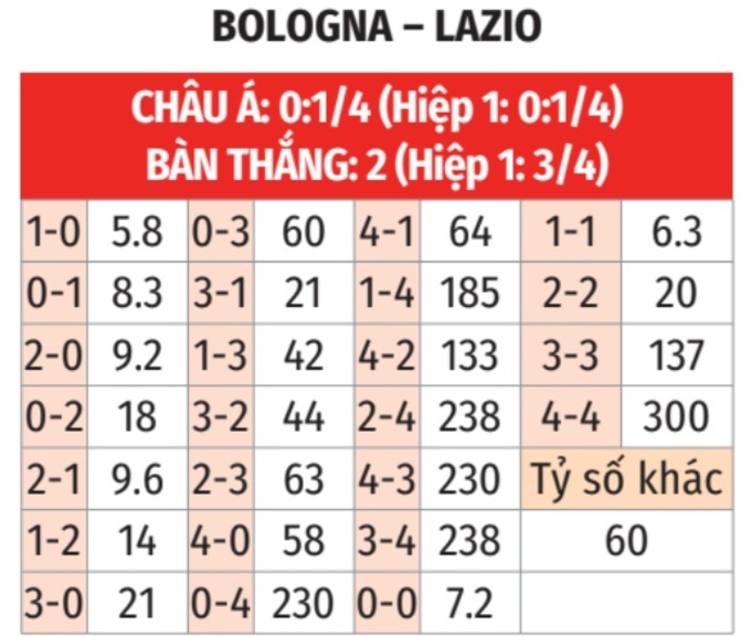 • Tối đa 4 góc hiệp 1: 3/4 trận gần đây của Bologna đều chỉ có nhiều nhất 4 quả phạt góc trong hiệp 1. Tình trạng tương tự xảy ra ở 4/5 trận mới nhất của Lazio.