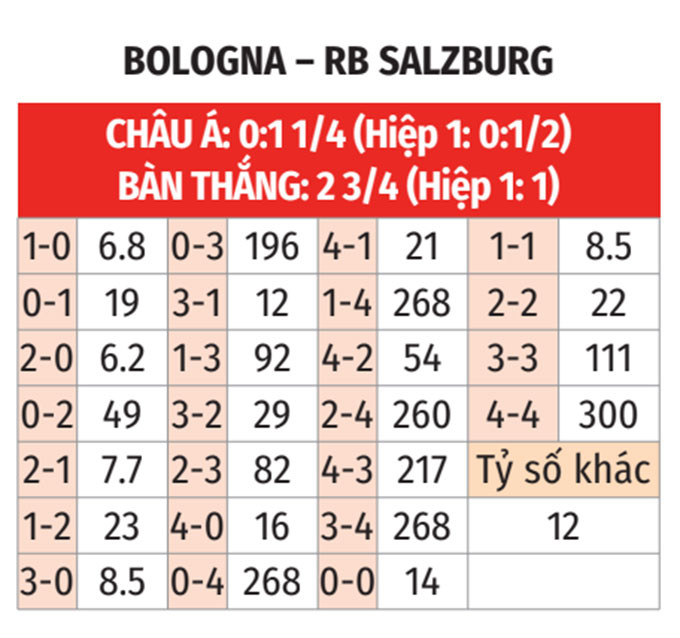 - Red Bull Salzburg thua theo châu Á: Trong 4 trận gần đây ở Europa League, Red Bull Salzburg thua theo châu Á tới 3 lần. Đá với Bologna thắng theo châu Á 7/9 trận vừa qua, các vị khách không phải là sự lựa chọn đáng tin cậy.