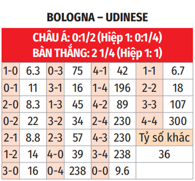 - Chẵn bàn thắng: 6/10 trận so T trước đây giữa 2 CLB Bologna vs Udinese có tổng bàn thắng chia hết cho 2. Ngoài ra, 7/10 trận sân khách gần đây của Udinese kết thúc với kết quả tương tự. Chưa hết, 6/10 trận gần nhất khi Bologna tiếp Udinese trên sân nhà có số bàn thắng chẵn.