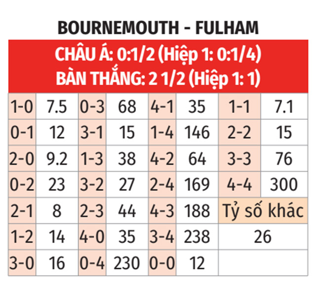 - Tối đa 2 bàn: 4/6 trận gần đây của Bournemouth chỉ có tối đa 2 bàn. 7/9 trận vừa qua của Fulham số bàn thắng cũng không lên được tới 2.
