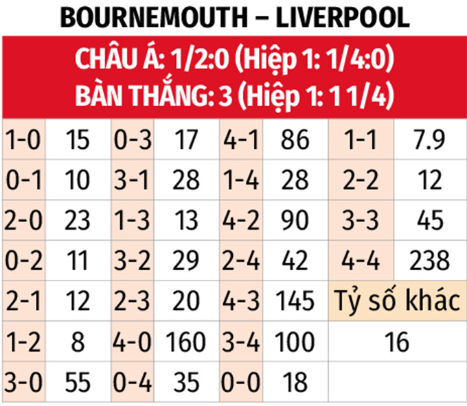 - Nhiều bàn thắng: 5/6 trận gần đây của Bournemouth đều có từ 4 bàn thắng trở lên. 3/4 trận sân khách vừa qua của Liverpool cùng 5/6 trận đối đầu gần nhất giữa hai đội cũng có tối thiểu 3 tình huống làm bàn.