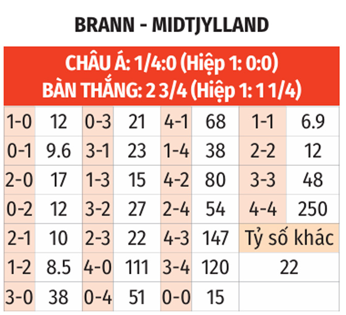- Hai đội cùng ghi bàn: Brann thành công trong việc ghi bàn ở 7/10 trận gần nhất còn với Midtjylland là ở 10 trận liên tiếp vừa qua. Bên cạnh đó, Brann ghi bàn ở 9/10 trận trên sân nhà vừa qua, còn với Midtjylland là ở 10 trận liên tiếp trên sân khách gần đây. Với xu hướng như vậy, khả năng cao hai đội sẽ cùng tìm được đường vào khung thành của nhau.