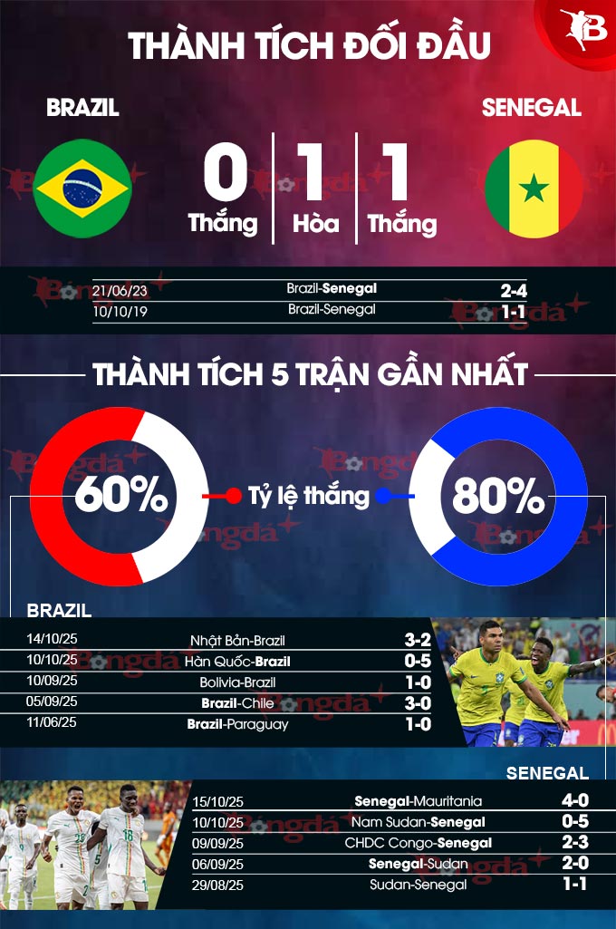 - Hai đội cùng ghi bàn: Cả hai cuộc đối đầu giữa hai đội đều khép lại mà không đội nào giữ sạch lưới nhà. Ngoài ra, Brazil cung ghi bàn ở 4/5 trận gần nhất. Với Senegal, chuỗi ghi bàn liên tiếp của họ đã lên đến 7 trận gần đây. Đặc biệt, trên sân trung lập, Senegal cũng luôn ghi bàn ở cả 3 trận vừa qua. Trận này khó có ngoại lệ.