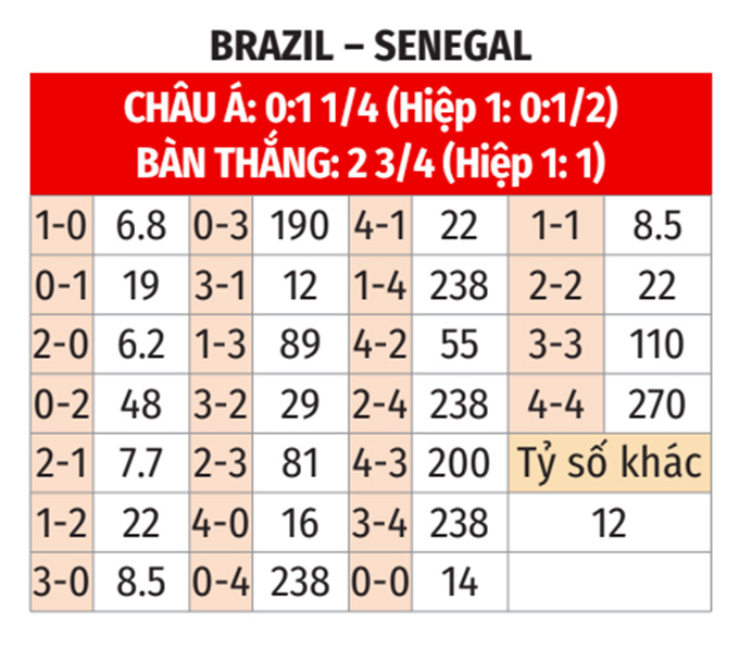 - Senegal thắng theo châu Á: Senegal thắng 6, hòa 1 ở 7 trận gần nhất; thắng 4/5 trận xa nhà gần đây. Trong khi Brazil thua 7/10 trận vừa qua. Do đó, những người yêu mến Senegal có thể đặt niềm tin vào họ ở trận này.